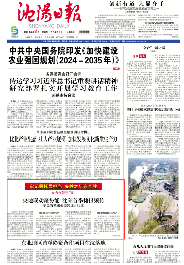 4月8日,沈陽日?qǐng)?bào)以“全省領(lǐng)跑!央地聯(lián)動(dòng)聚勢(shì)能 沈陽首季捷報(bào)頻傳”為題,在頭版對(duì)沈陽市奮力奪取開門紅進(jìn)行報(bào)道。